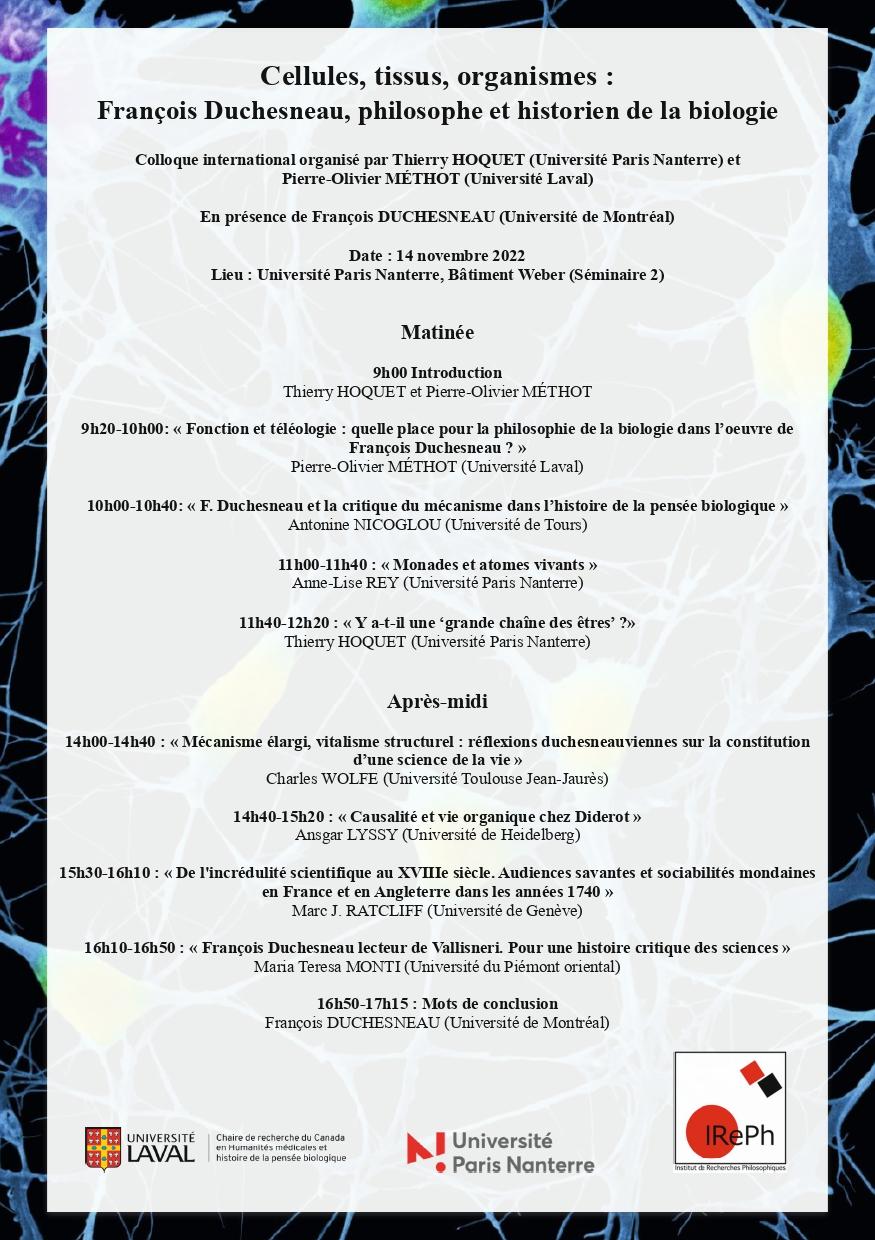 10h-10h40 : « F. Duchesneau et la critique du mécanisme dans l’histoire de la pensée biologique »